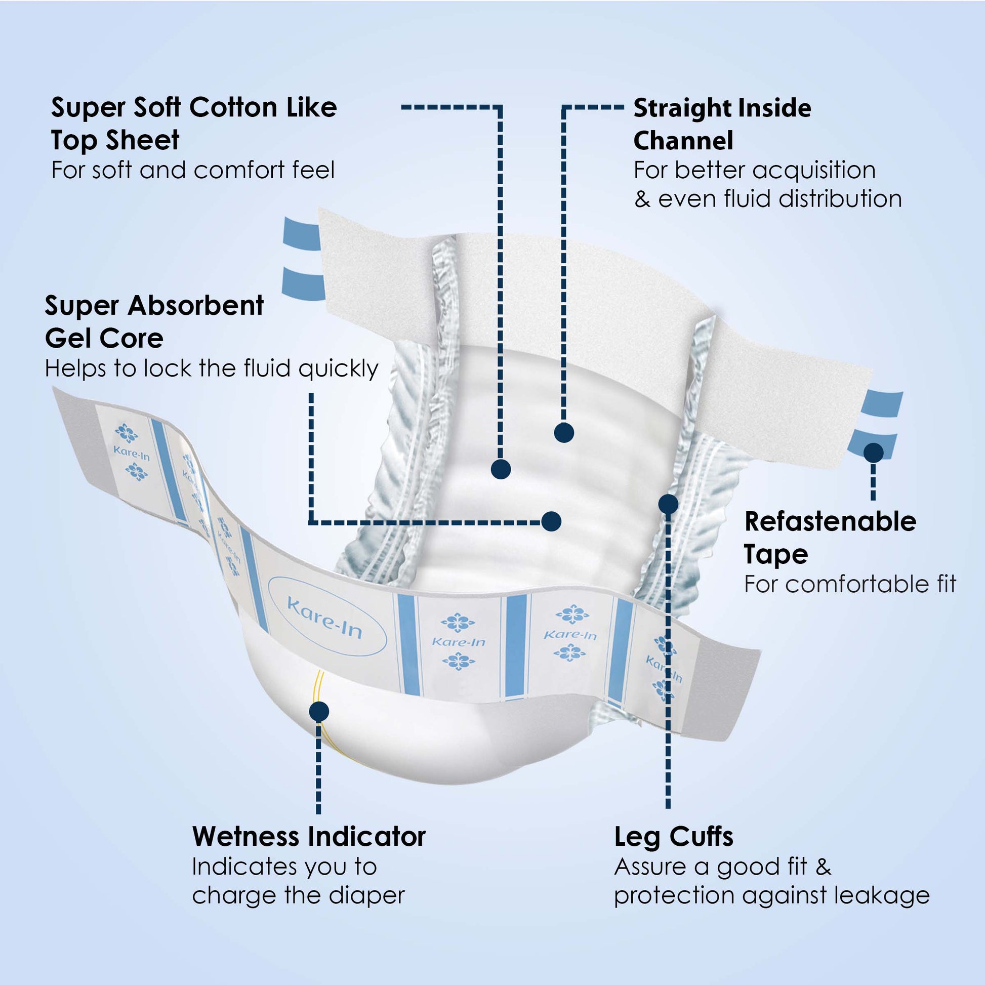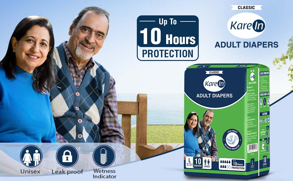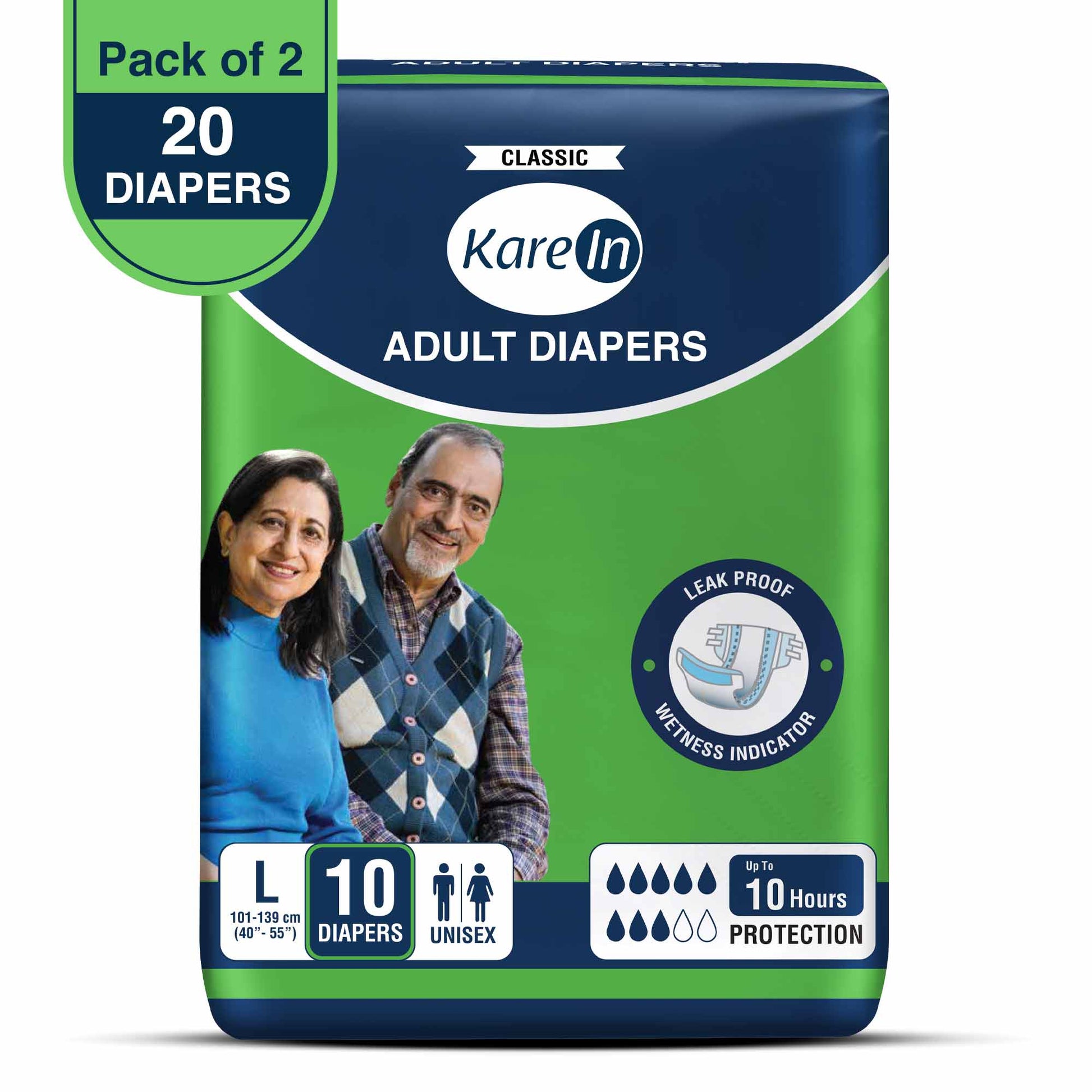 KareIn Classic Adult Diapers, Large, Waist Size 101-139 Cm (40"-55"), Tape Style, Unisex, High Absorbency, Leak Proof, Wetness Indicator, Pack of 2, 20 diapers