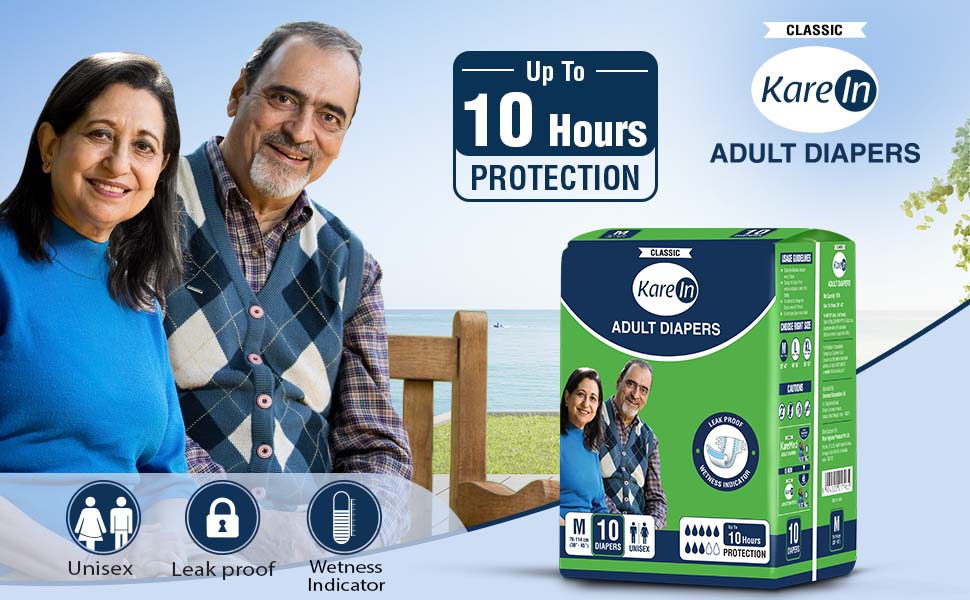 KareIn Classic Adult Diapers, Medium, Waist Size 76-114 Cm (30"-45"), Tape Style, Unisex, High Absorbency, Leak Proof, Wetness Indicator, Pack of 6, 60 diapers
