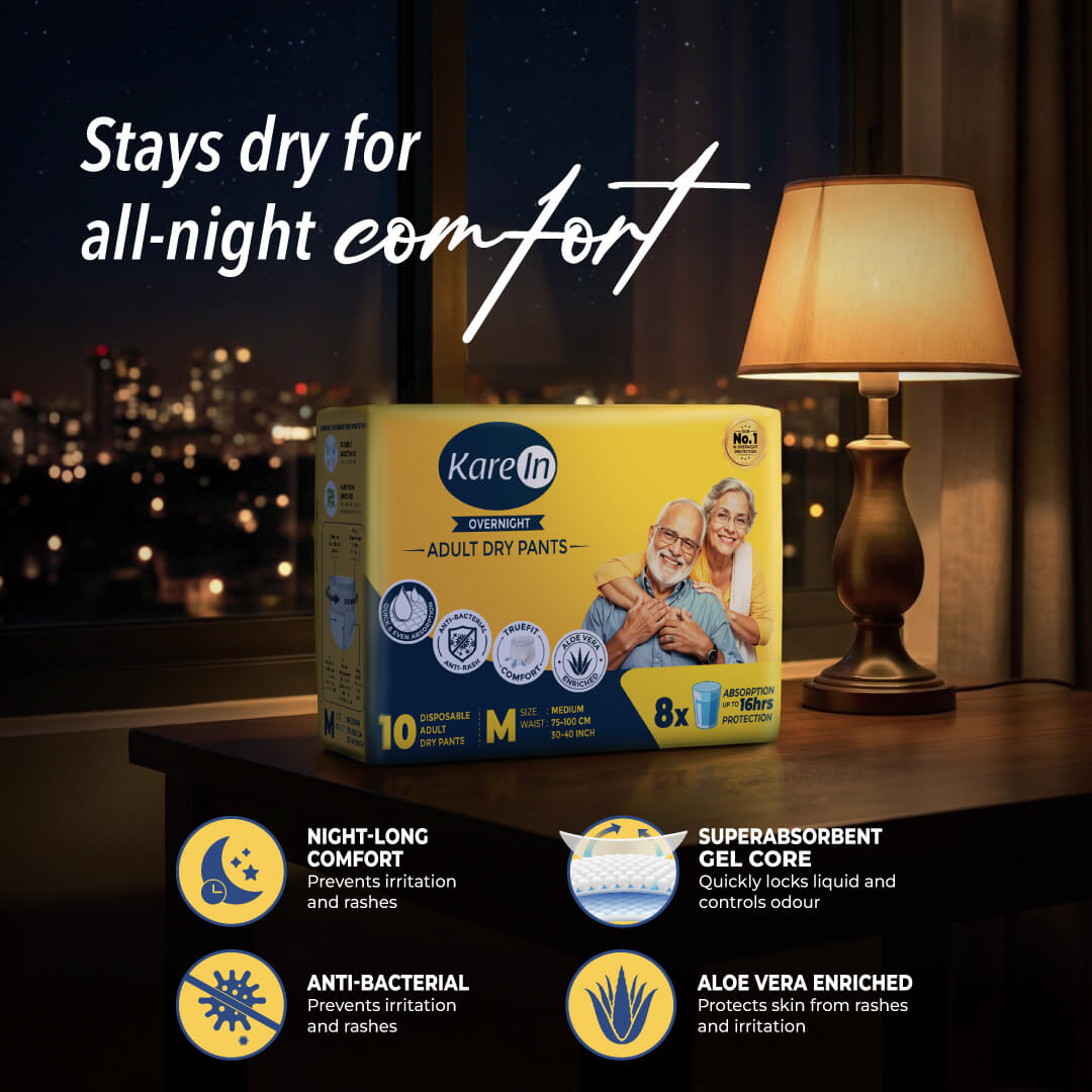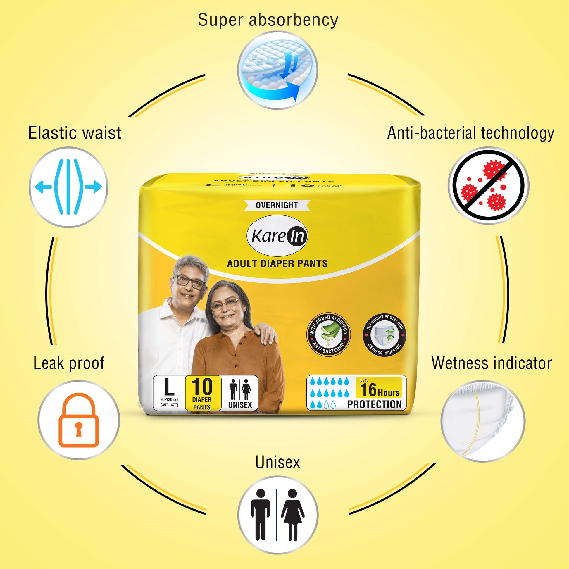 KareIn Overnight Adult Diaper Pants, Large 90-120 Cm (35"- 47"), Unisex, Leakproof, Elastic Waist, With Aloe Vera Lotion, Anti-Bacterial, ADL, Wetness Indicator, 10 Count