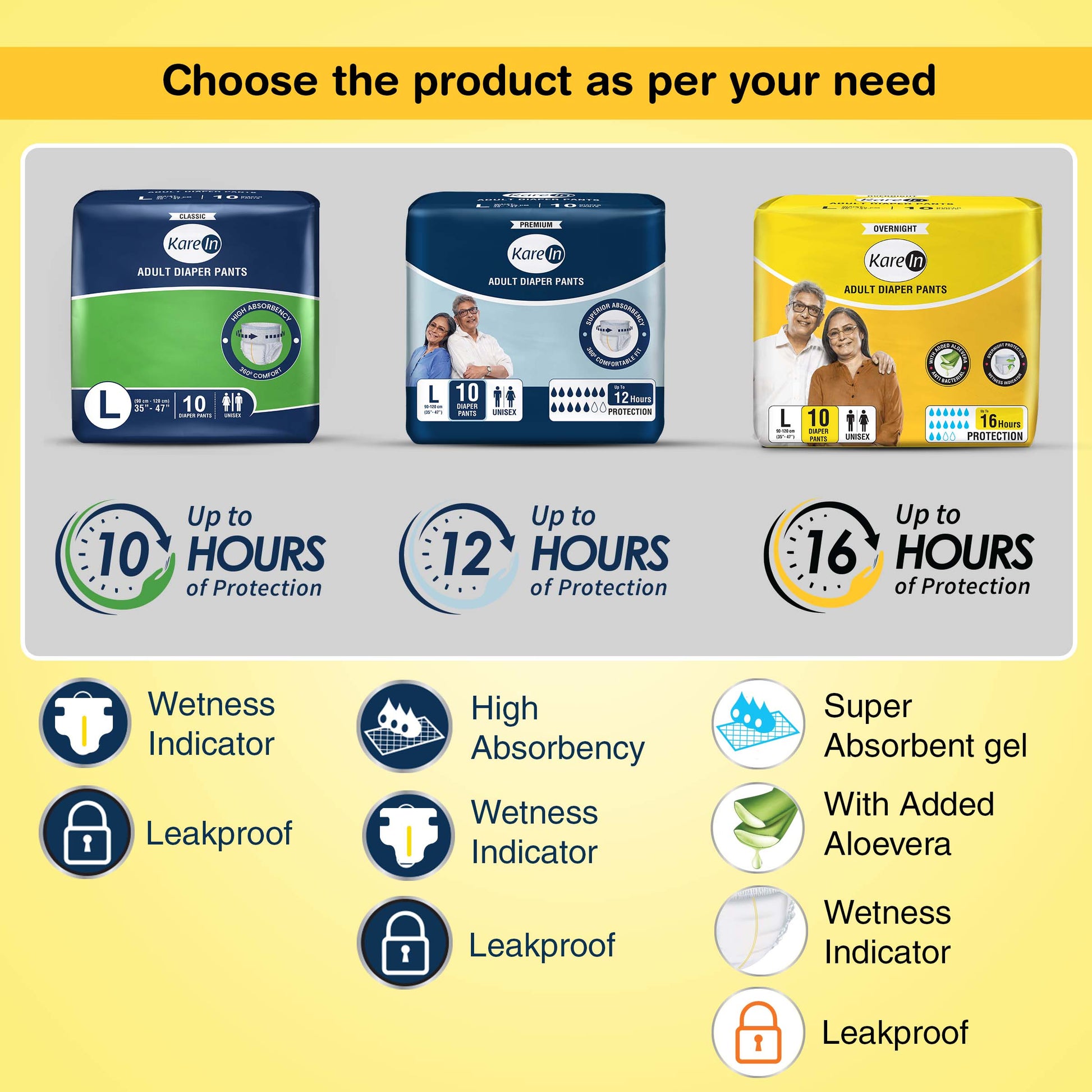 KareIn Overnight Adult Diaper Pants, Large 90-120 Cm (35"- 47"), Unisex, Leakproof, Elastic Waist, With Aloe Vera Lotion, Anti-Bacterial, ADL, Wetness Indicator, 30 Count