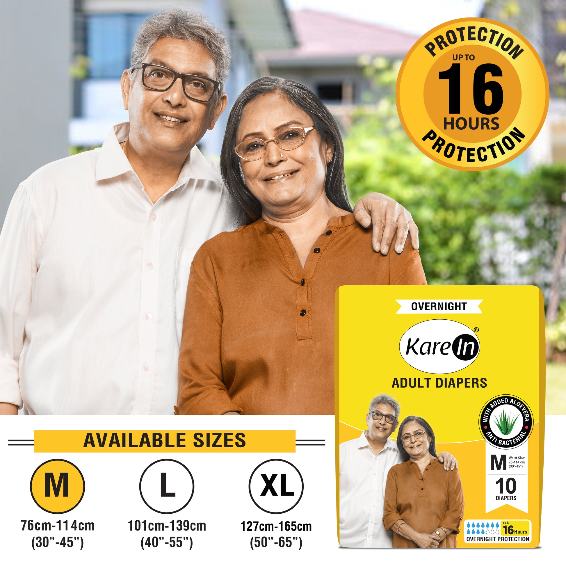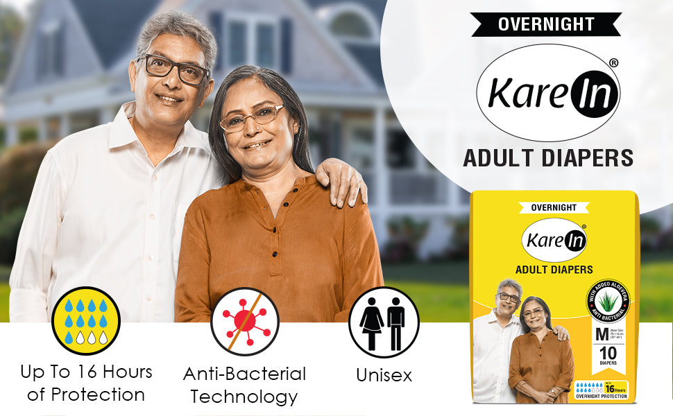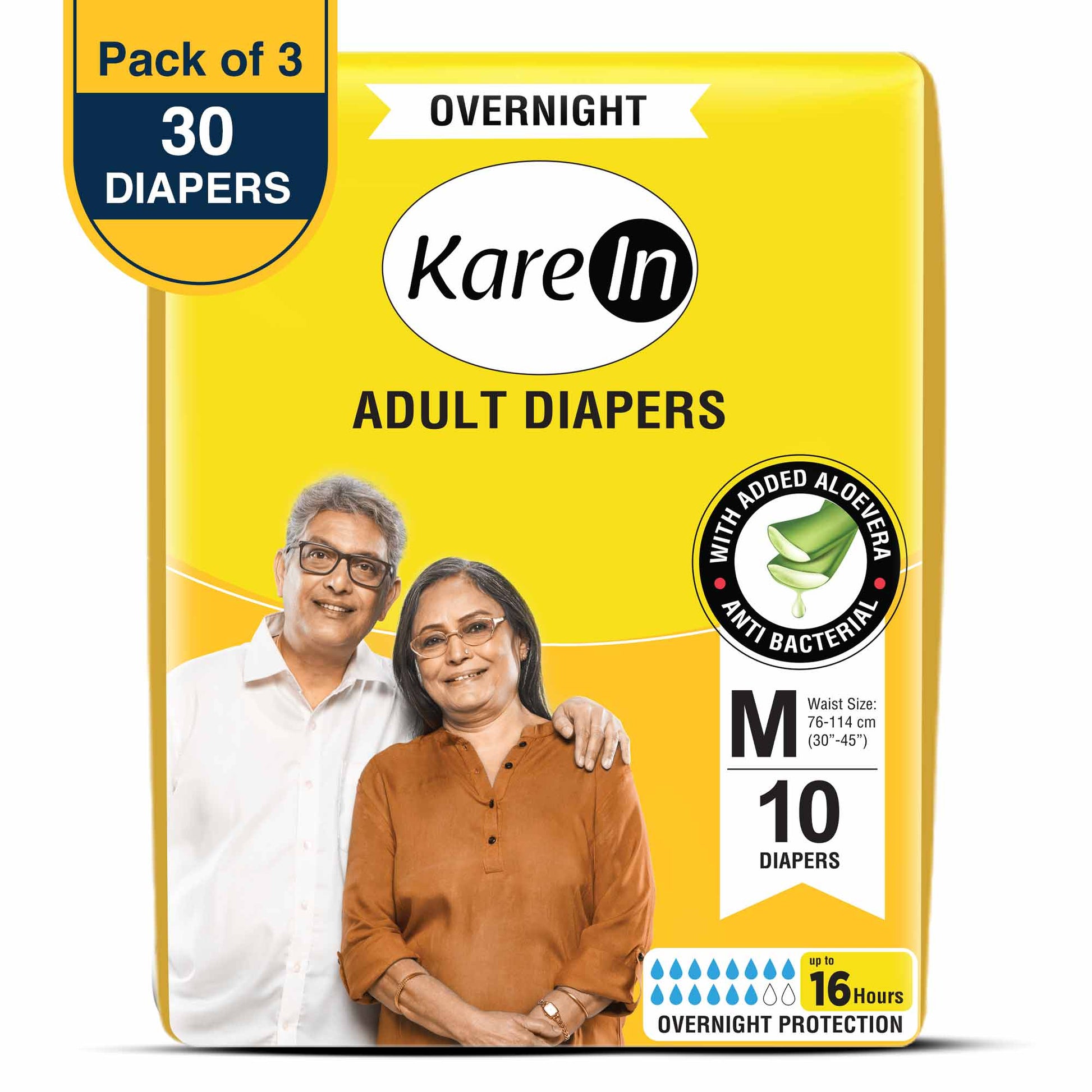 KareIn Overnight Adult Diapers, Medium, Waist Size 76-114 Cm (30"- 45"), Tape Style, High Absorbency, Odour Free, With Aloe Vera Lotion, Anti-Bacterial, ADL, Leak Proof, Pack of 3, 30 Count