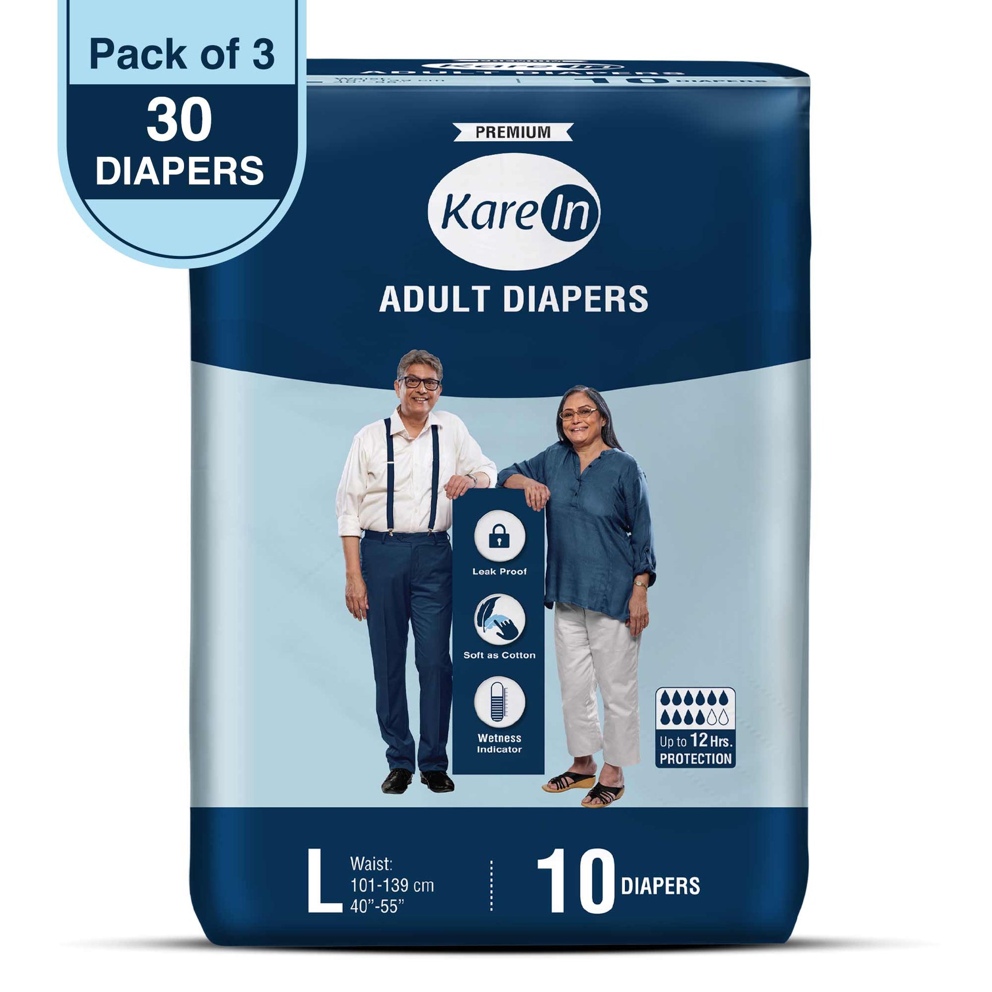 KareIn Premium Adult Diapers, Large, Waist Size 101-139 Cm (40"-55"), Tape Style, Unisex, High Absorbency, Leak Proof, Wetness Indicator, Pack of 3, 30 diapers