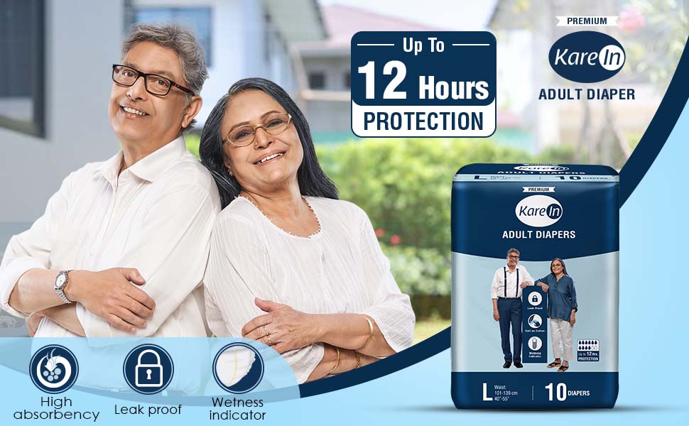 KareIn Premium Adult Diapers, Large, Waist Size 101-139 Cm (40"-55"), Tape Style, Unisex, High Absorbency, Leak Proof, Wetness Indicator, Pack of 6, 60 diapers