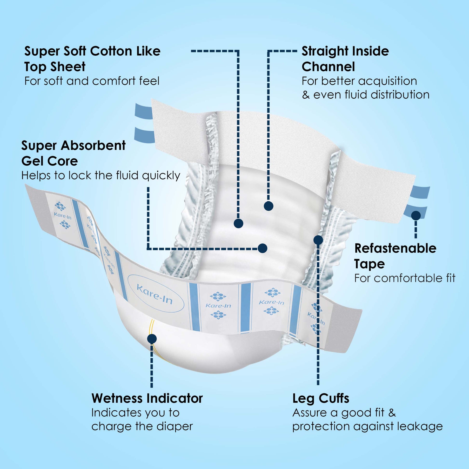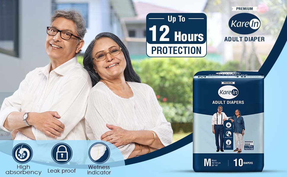 KareIn Premium Adult Diapers, Medium, Waist Size 76-114 Cm (30"-45"), Tape Style, Unisex, High Absorbency, Leak Proof, Wetness Indicator, 10 diapers